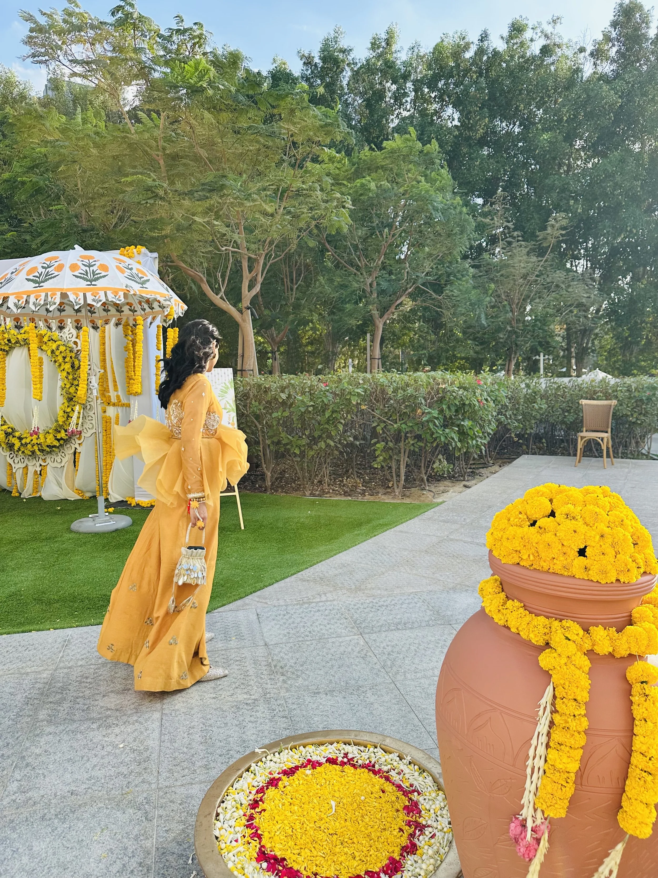 Known as the ‘turmeric’ ceremony. Traditionally, you would apply the haldi all over the bride (and groom) but the contemporary approach is just symbolic; a dab of haldi on your palm followed by a big party. Taking place out in the Dubai heat, it was scenic, colourful and fun, showcasing all sorts of beautiful yellow and antique golden hues.